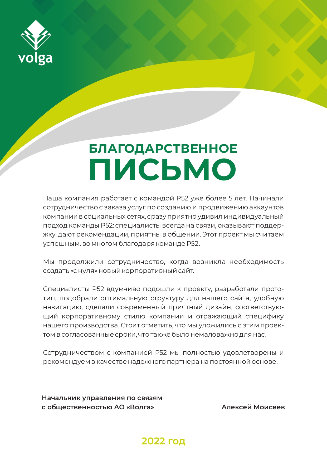 Мы очень довольны сотрудничеством с «Р52.РУ» и хотим рекомендовать их как профессиональную, надежную и ответственную компанию.